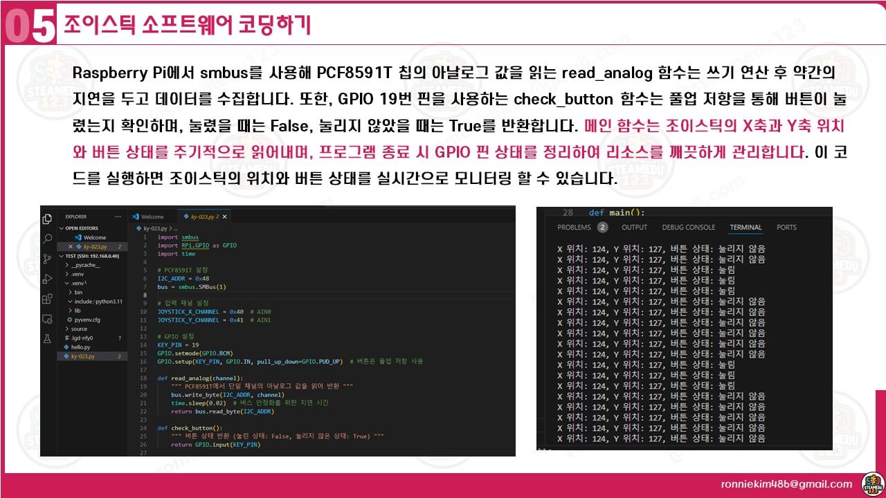 조이스틱(KY-023)과 PCF8591T 칩을 사용하여 Raspberry Pi에서 소프트웨어 코딩을 진행할 때, Python을 활용한 I2C 통신을 구현하는 방법을 소개합니다. 이 과정에서 필요한 라이브러리는 smbus로, Raspberry Pi에서 I2C 기반 장치와의 통신을 지원합니다.