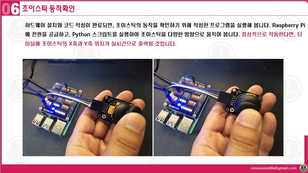 조이스틱(KY-023) 모듈을 사용한 이 프로젝트를 통해 기본적인 하드웨어 인터페이싱과 소프트웨어 프로그래밍에 대한 실습 경험을 얻을 수 있습니다. 이 경험은 다양한 전자 DIY 프로젝트나 교육적 목적으로 확장될 수 있으며, Raspberry Pi를 이용한 보다 복잡한 제어 시스템 개발의 기초가 될 수 있습니다. 계속해서 실험하고,