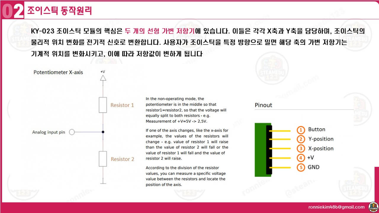 조이스틱은 각 축을 따라 움직이는 내부 슬라이더에 의해 컨트롤되며, 이는 가변 저항의 원리를 사용하여 위치에 따른 전압 변화를 생성합니다. 이를 통해 사용자는 로봇의 움직임, 비디오 게임 내 캐릭터 조종 등 다양한 어플리케이션에서 정밀한 제어를 수행할 수 있습니다. KY-023 조이스틱은 그 저렴한 가격과 사용의 용이성 때문에 교육용 프로젝트와 취미 생활에서도 많이 사용되고 있습니다.