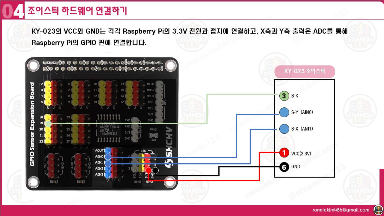 KY-023의 VCC와 GND는 각각 Raspberry Pi의 5V 전원과 접지에 연결하고, X축과 Y축 출력은 ADC를 통해 Raspberry Pi의 GPIO 핀에 연결합니다. 이렇게 하면 조이스틱의 위치에 따라 변하는 아날로그 신호를 Raspberry Pi가 처리할 수 있습니다.