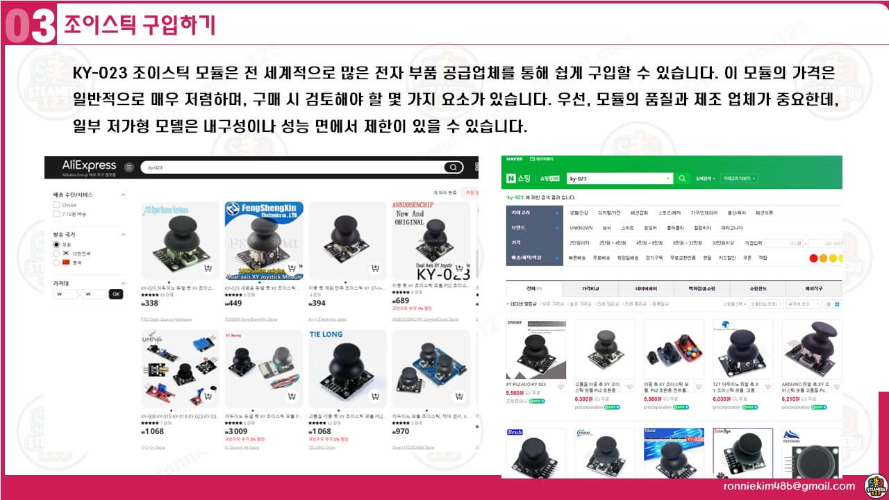 KY-023 조이스틱 모듈은 전 세계적으로 많은 전자 부품 공급업체를 통해 쉽게 구입할 수 있습니다. 이 모듈의 가격은 일반적으로 매우 저렴하며, 구매 시 검토해야 할 몇 가지 요소가 있습니다.