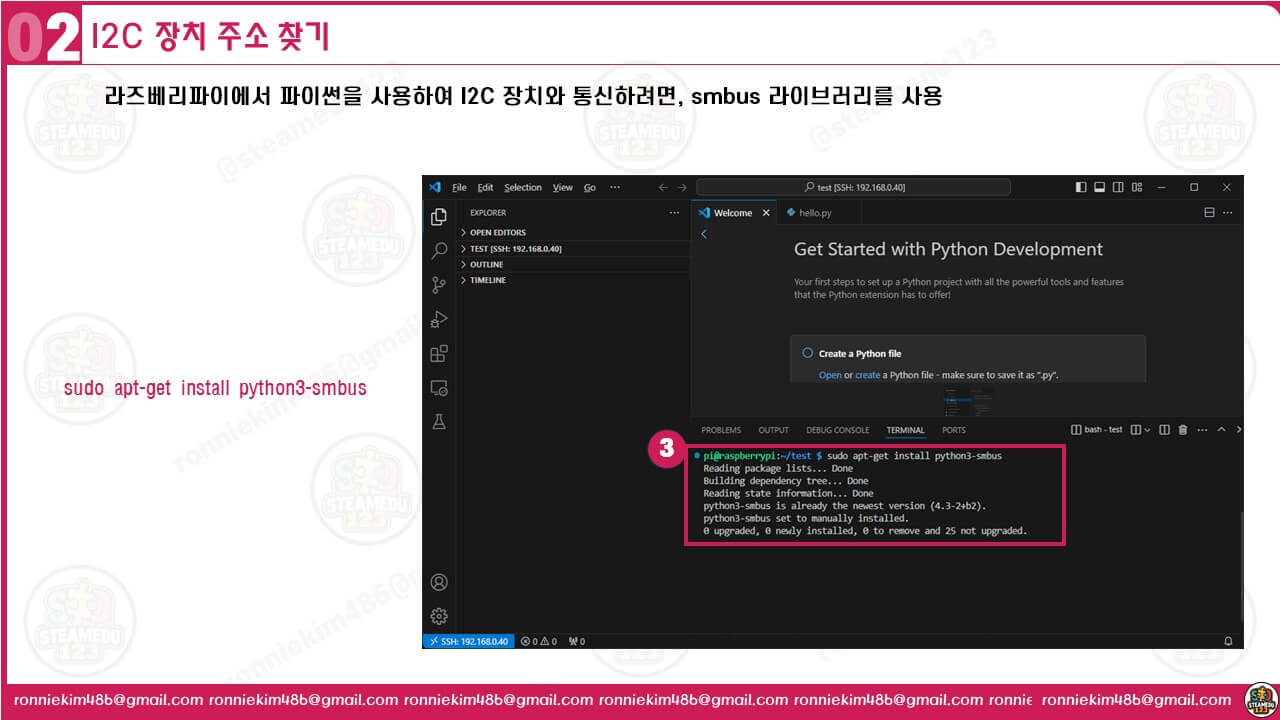 라즈베리파이에서 파이썬을 사용하여 I2C 장치와 통신하려면, smbus 라이브러리를 사용할 수 있습니다.