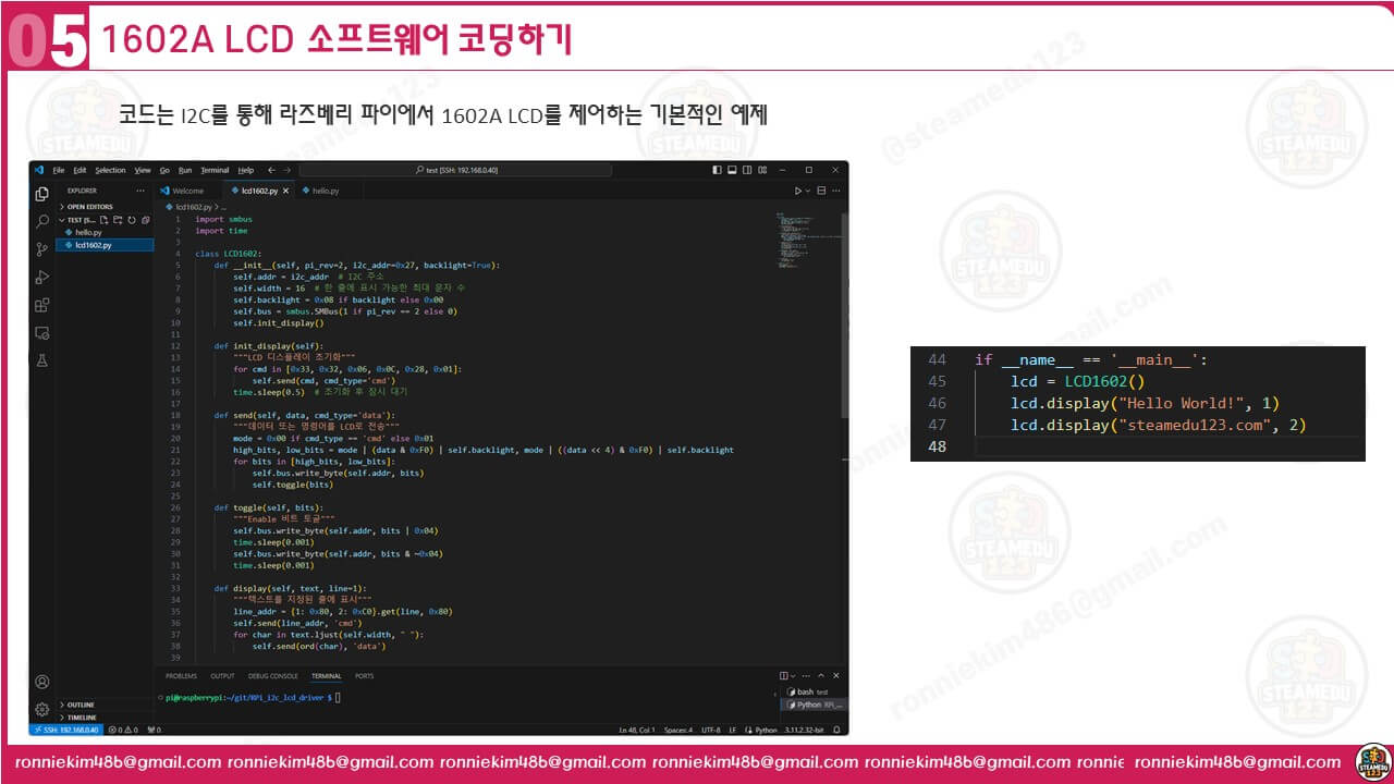 - 메인 섹션에서는 LCD1602 클래스의 인스턴스를 생성하고, 첫 번째 줄에 "Hello World!", 두 번째 줄에 "steamedu123.com"을 출력하는 예제를 보여줍니다.