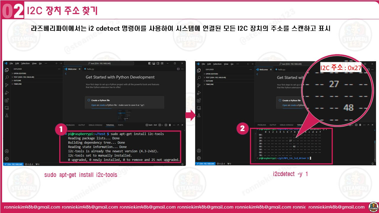 라즈베리파이에서는 i2 cdetect 명령어를 사용하여 시스템에 연결된 모든 I2C 장치의 주소를 스캔하고 표시할 수 있습니다.