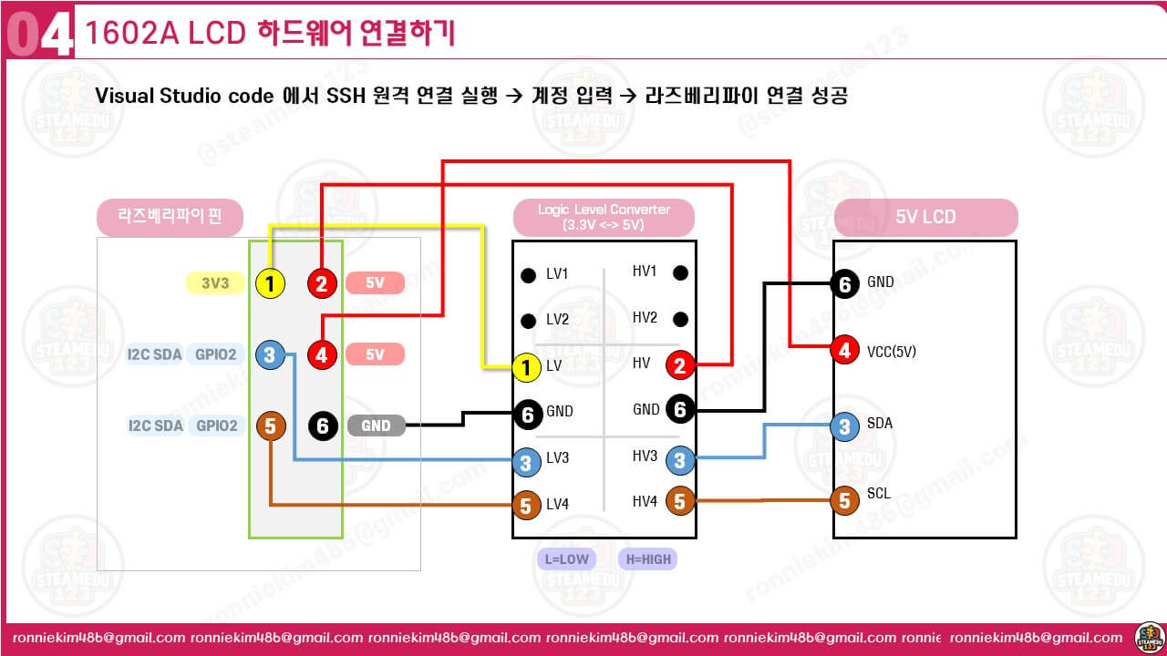 - 레벨 컨버터의 LV4 핀을 라즈베리 파이의 SCL 핀에 연결합니다.