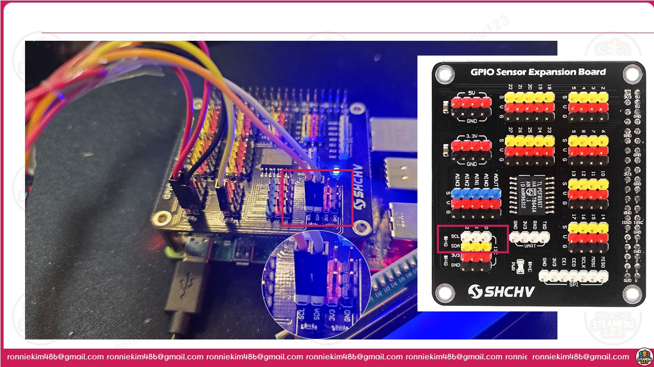 - 라즈베리 파이에서 I2C 통신에 사용되는 SCL과 SDA 핀을 식별합니다.