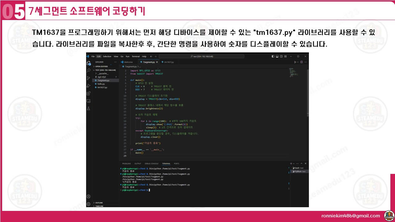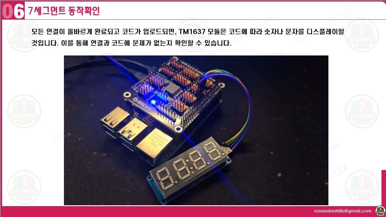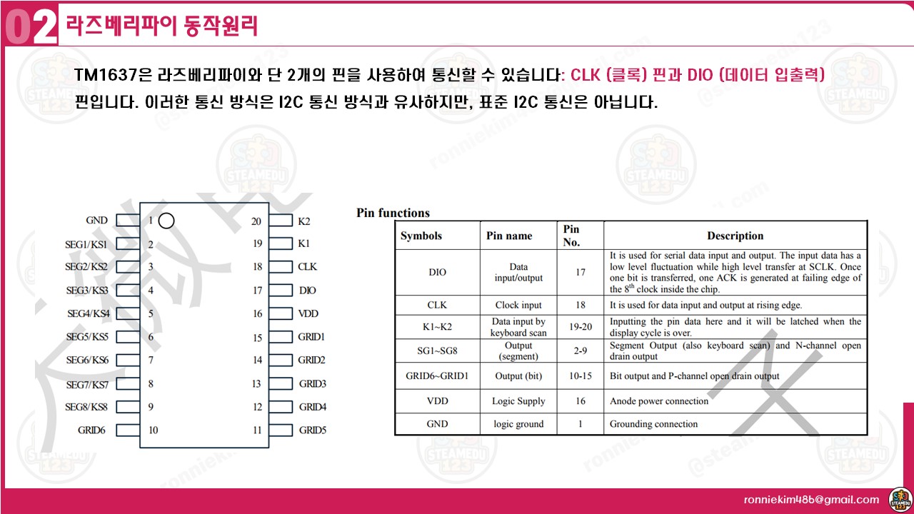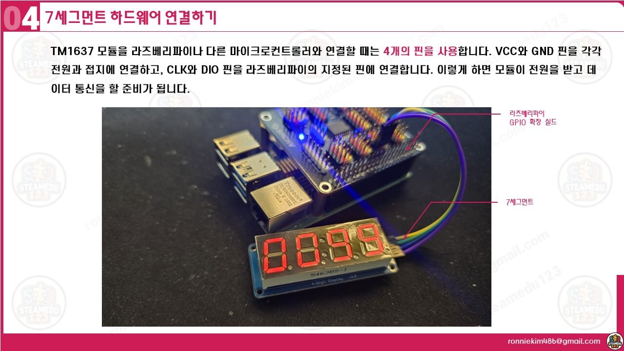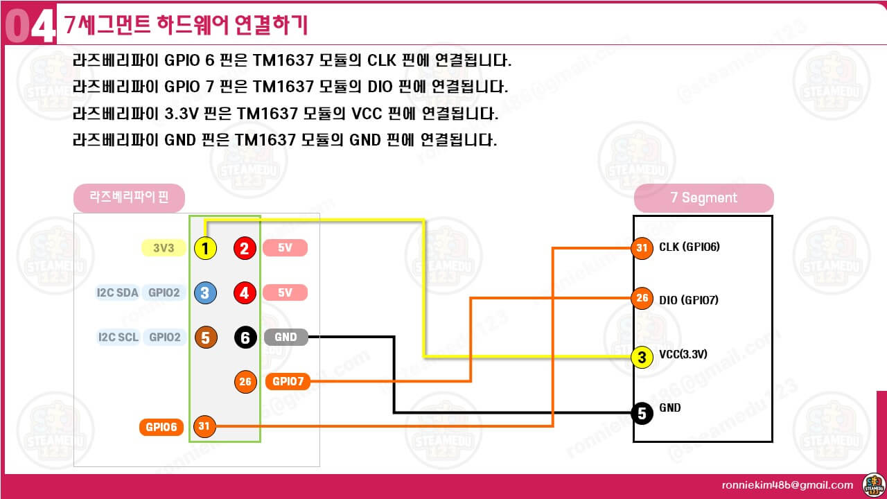 이렇게 연결하면 라즈베리파이에서 TM1637 모듈을 제어할 수 있습니다.