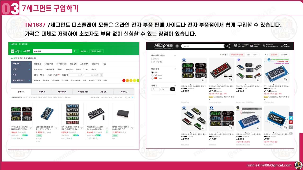 TM1637 7세그먼트 디스플레이 모듈은 온라인 전자 부품 판매 사이트나 전자 부품점에서 쉽게 구입할 수 있습니다. 가격은 대체로 저렴하여 초보자도 부담 없이 실험할 수 있는 장점이 있습니다.