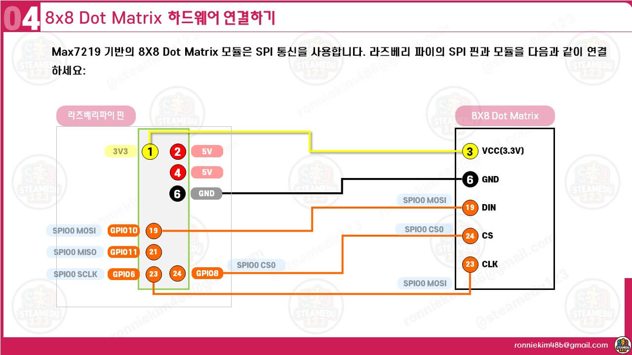 Max7219 기반의 8X8 Dot Matrix 모듈은 SPI 통신을 사용합니다. 라즈베리 파이의 SPI 핀과 모듈을 다음과 같이 연결하세요: