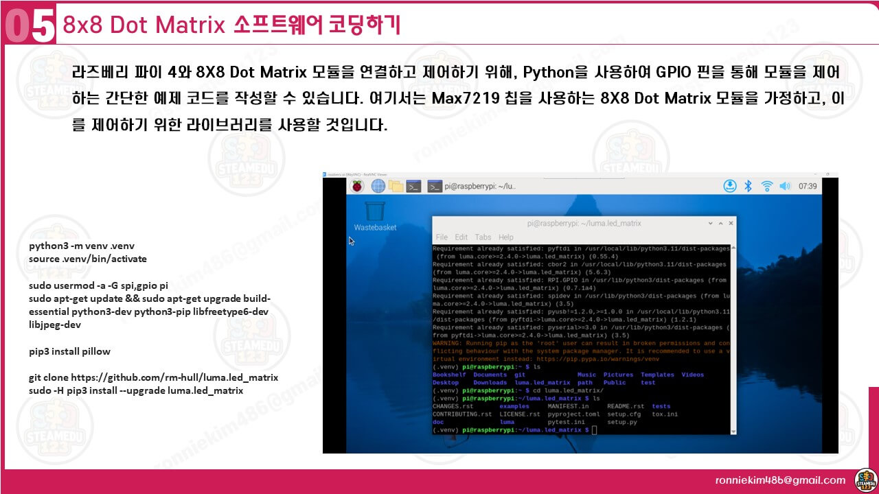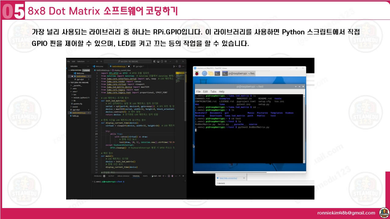 하드웨어 연결이 완료되면, 파이썬 소스코드를 코딩할 수 있습니다. 우선 라이브러리를 설치합니다. 라즈베리 파이 4와 8X8 Dot Matrix 모듈을 연결하고 제어하기 위해, Python을 사용하여 GPIO 핀을 통해 모듈을 제어하는 간단한 예제 코드를 작성할 수 있습니다. 여기서는 Max7219 칩을 사용하는 8X8 Dot Matrix 모듈을 가정하고, 이를 제어하기 위한 라이브러리를 사용할 것입니다.