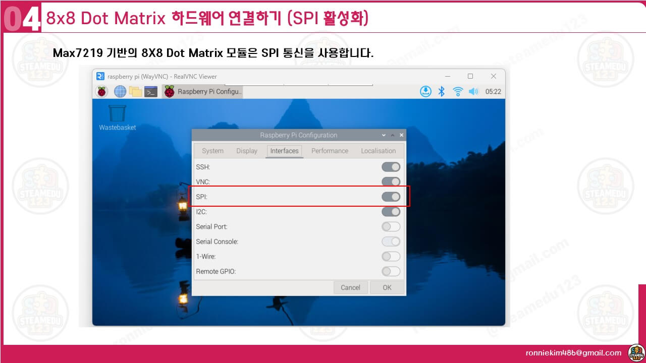 SPI 인터페이스를 활성화하려면, 라즈베리 파이 설정에서 SPI를 활성화해야 합니다. sudo raspi-config 명령어를 사용하여 인터페이스 옵션에서 SPI를 활성화하세요. 또는 RealVNC Viewer를 사용할 수 있습니다.