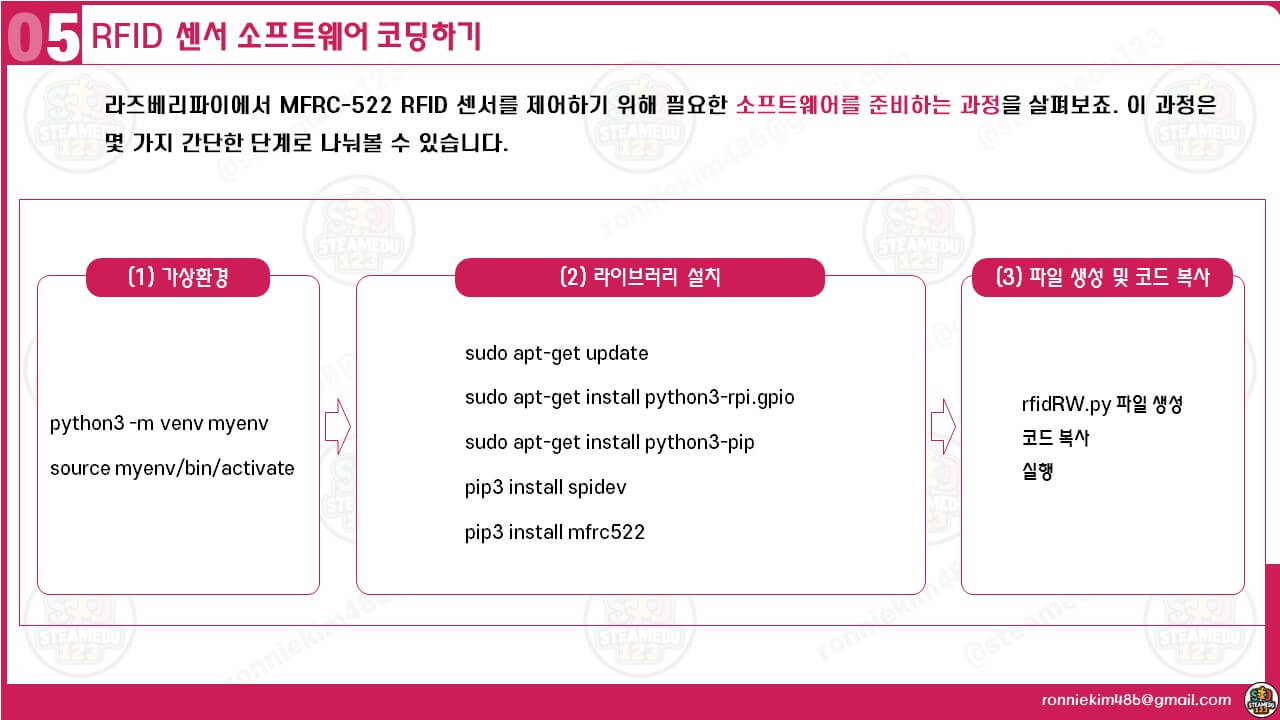 라즈베리파이에서 RFID(RFID-RC522)를 제어하기 위한 소프트웨어 준비 과정은 다음과 같은 단계로 이루어집니다: