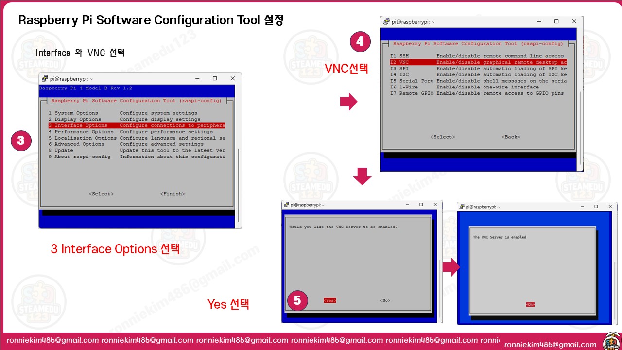 (4) VNC 활성화: 같은 방식으로 Interface Options > VNC로 이동합니다. Yes를 클릭하여 VNC 서버를 활성화합니다. 설정을 마친 후, Finish를 클릭하여 설정 창을 닫습니다.