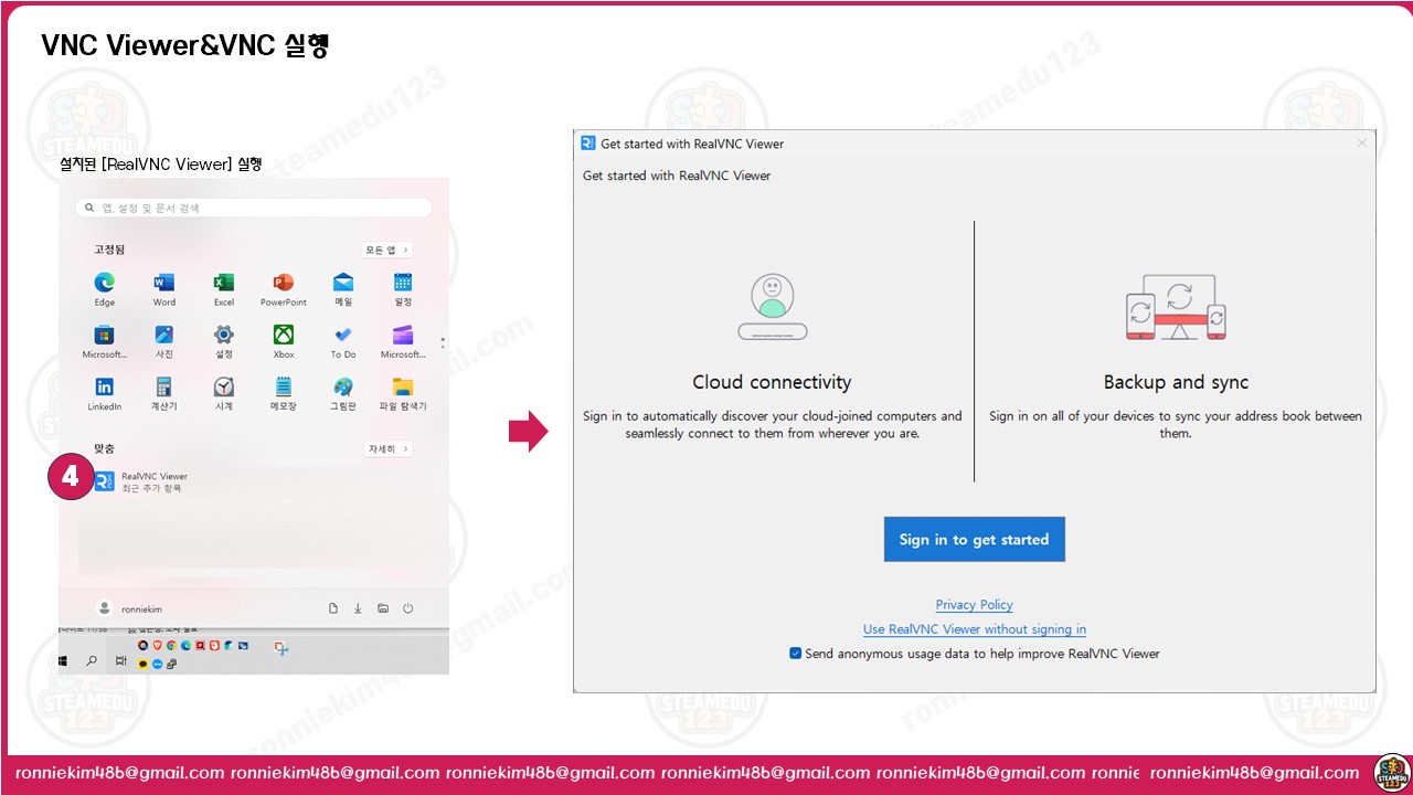 설치한 VNC Viewer를 실행합니다. 가입은 필요 없으니, 가입 요구가 나오면 건너뛰세요.