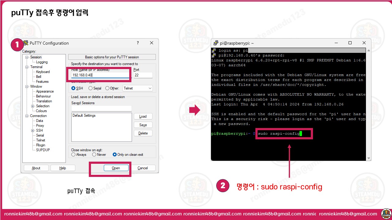Putty 창에서 다음 명령어를 입력하여 라즈베리 파이의 설정 메뉴를 엽니다:
