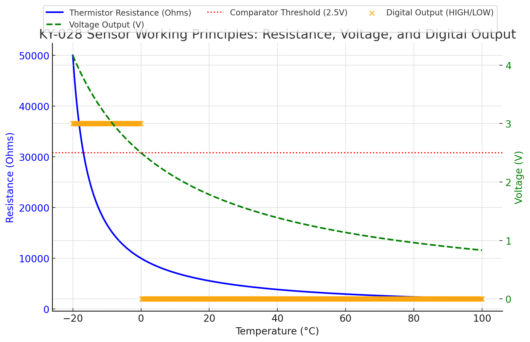 KY-028 센서는 다음의 단계를 통해 온도 변화를 신호로 변환하고, 이를 판단하여 디지털 및 아날로그 출력을 제공합니다: