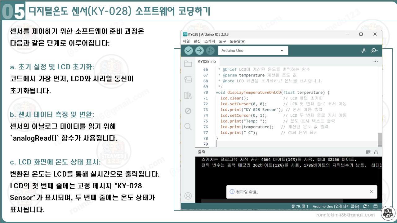 이 과정을 통해 초보자도 아두이노와 KY-028 센서를 쉽게 이해하고 활용할 수 있으며, 이를 기반으로 더 복잡한 프로젝트로 확장할 수 있습니다.