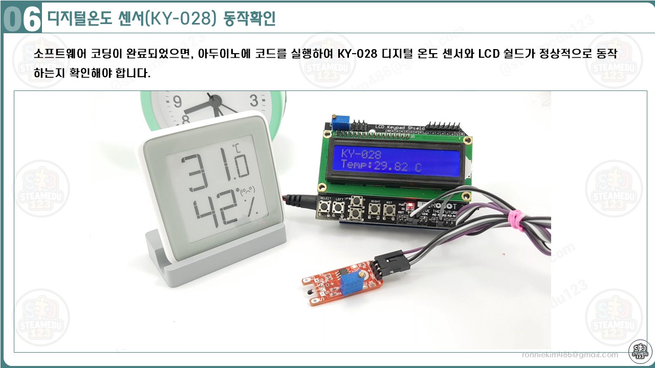KY-028 디지털 온도 센서와 LCD 쉴드가 제대로 동작하는지 확인하기 위한 단계는 다음과 같습니다: