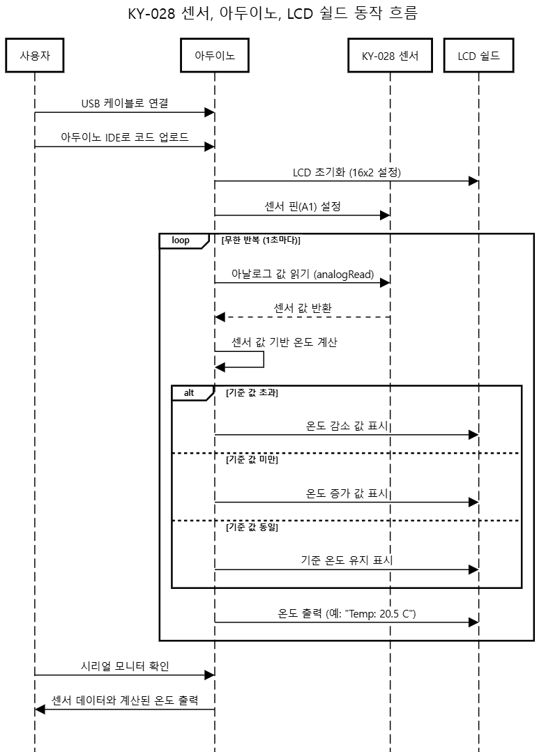 이러한 구조와 흐름으로 KY-028 센서와 LCD 쉴드를 활용한 온도 측정 시스템이 동작합니다.