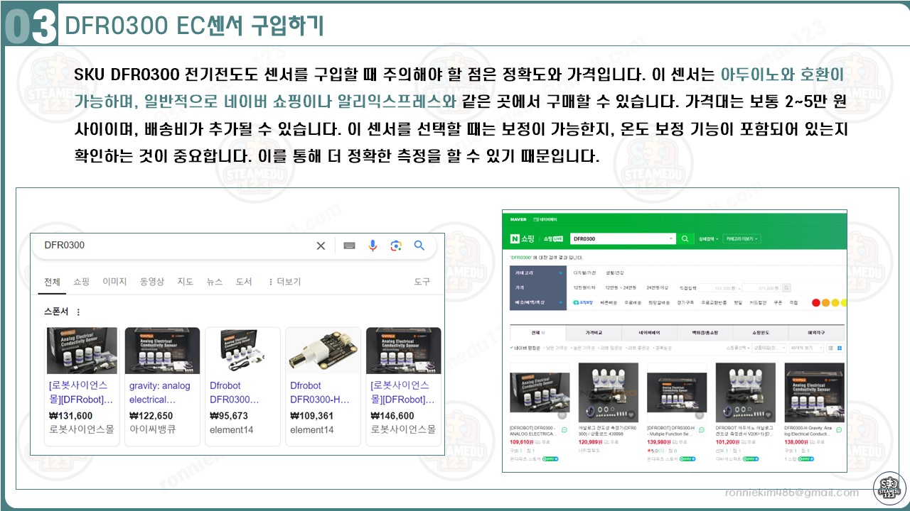 SKU DFR0300 전기전도도 센서를 구입할 때 주의해야 할 점은 정확도와 가격입니다. 이 센서는 아두이노와 호환이 가능하며, 일반적으로 네이버 쇼핑이나 알리익스프레스와 같은 곳에서 구매할 수 있습니다. 가격대는 보통 2~5만 원 사이이며, 배송비가 추가될 수 있습니다. 이 센서를 선택할 때는 보정이 가능한지, 온도 보정 기능이 포함되어 있는지 확인하는 것이 중요합니다. 이를 통해 더 정확한 측정을 할 수 있기 때문입니다.
