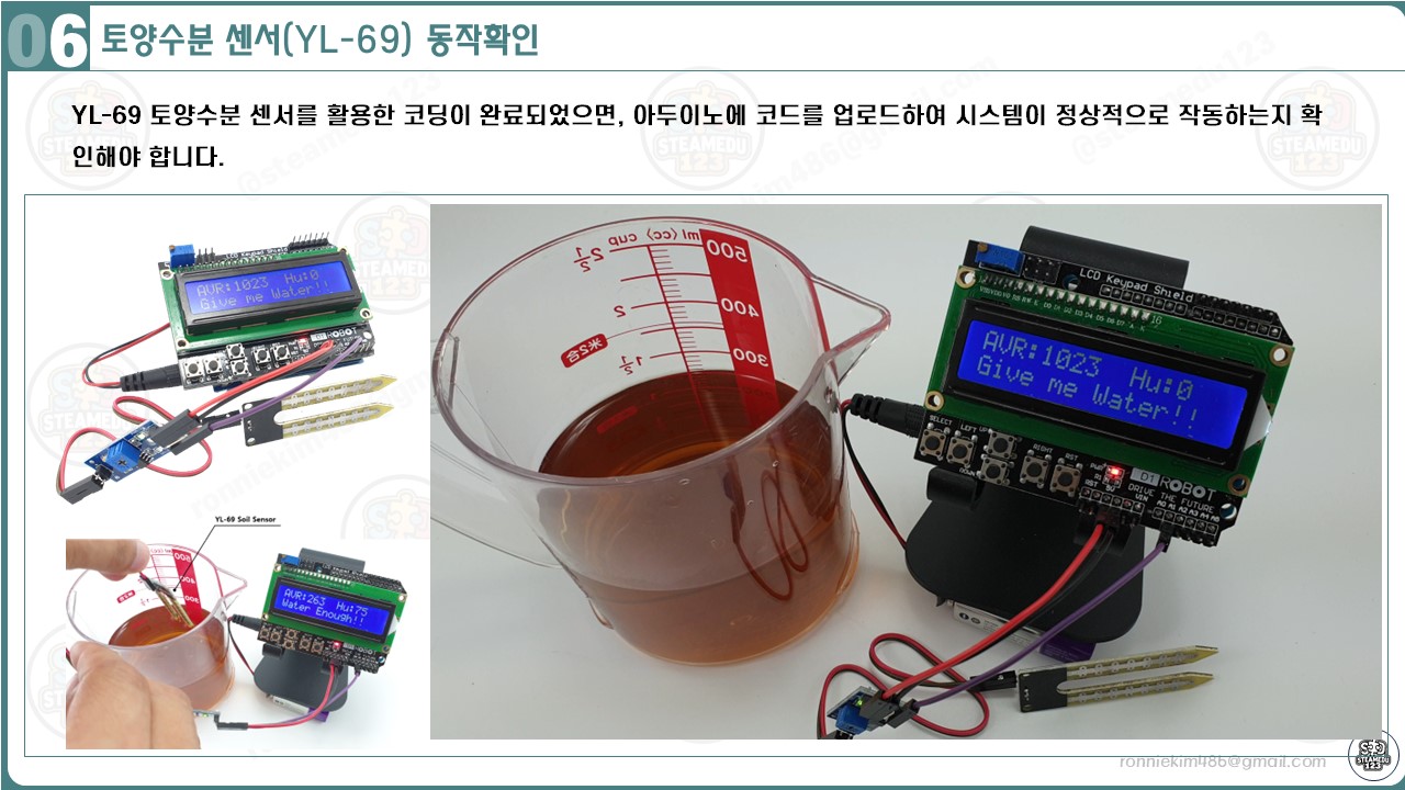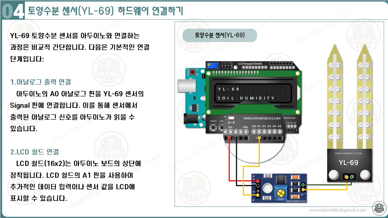 이 구성은 아두이노가 YL-69 센서에서 데이터를 읽고, 이를 LCD 쉴드를 통해 사용자에게 시각적으로 보여주는 시스템을 완성합니다.