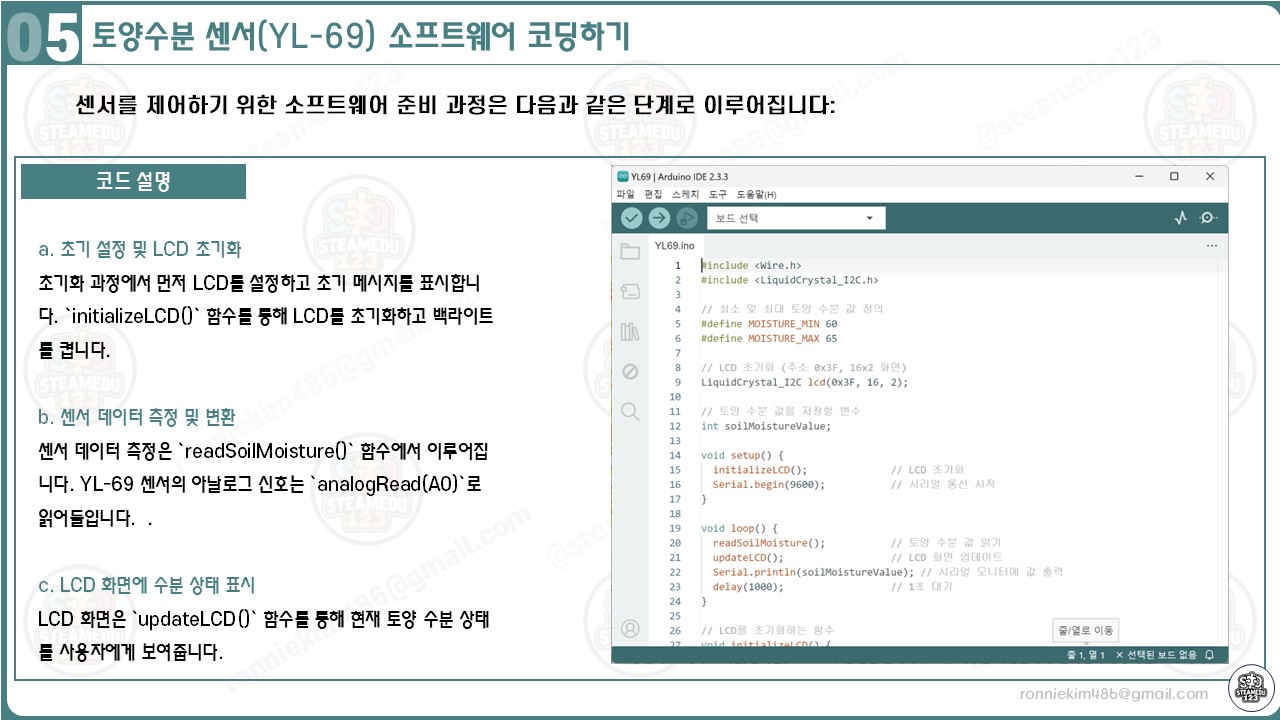 이 코드는 아두이노, LCD 쉴드, YL-69 센서를 통해 토양 상태를 효율적으로 모니터링할 수 있는 구조로 설계되었습니다. 이를 통해 자동 급수 시스템, 스마트 화분 등 다양한 프로젝트에 활용할 수 있습니다.