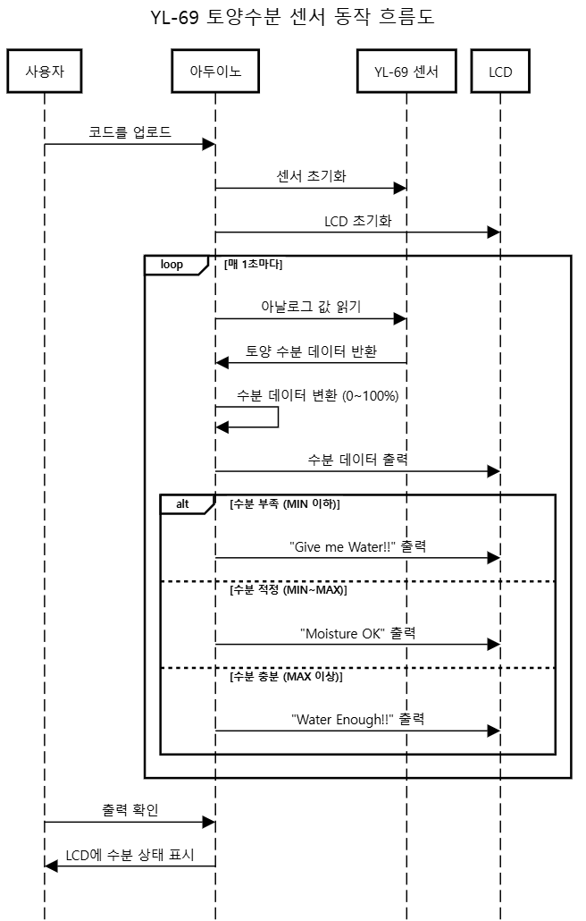 - 측정 단계: YL-69 센서를 통해 토양 수분 값을 읽어옵니다.