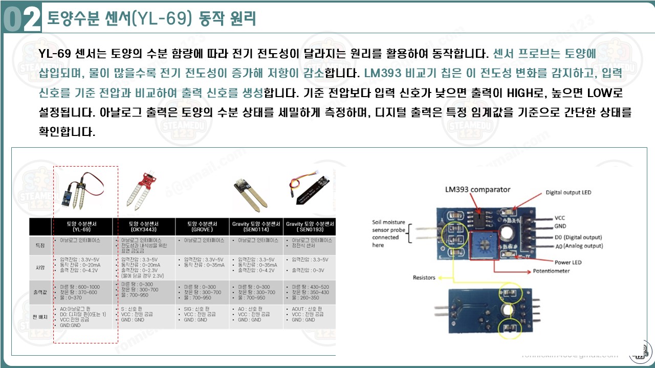 - YL-69 토양수분 센서: 토양의 수분 상태를 측정하여 아날로그 값을 출력.