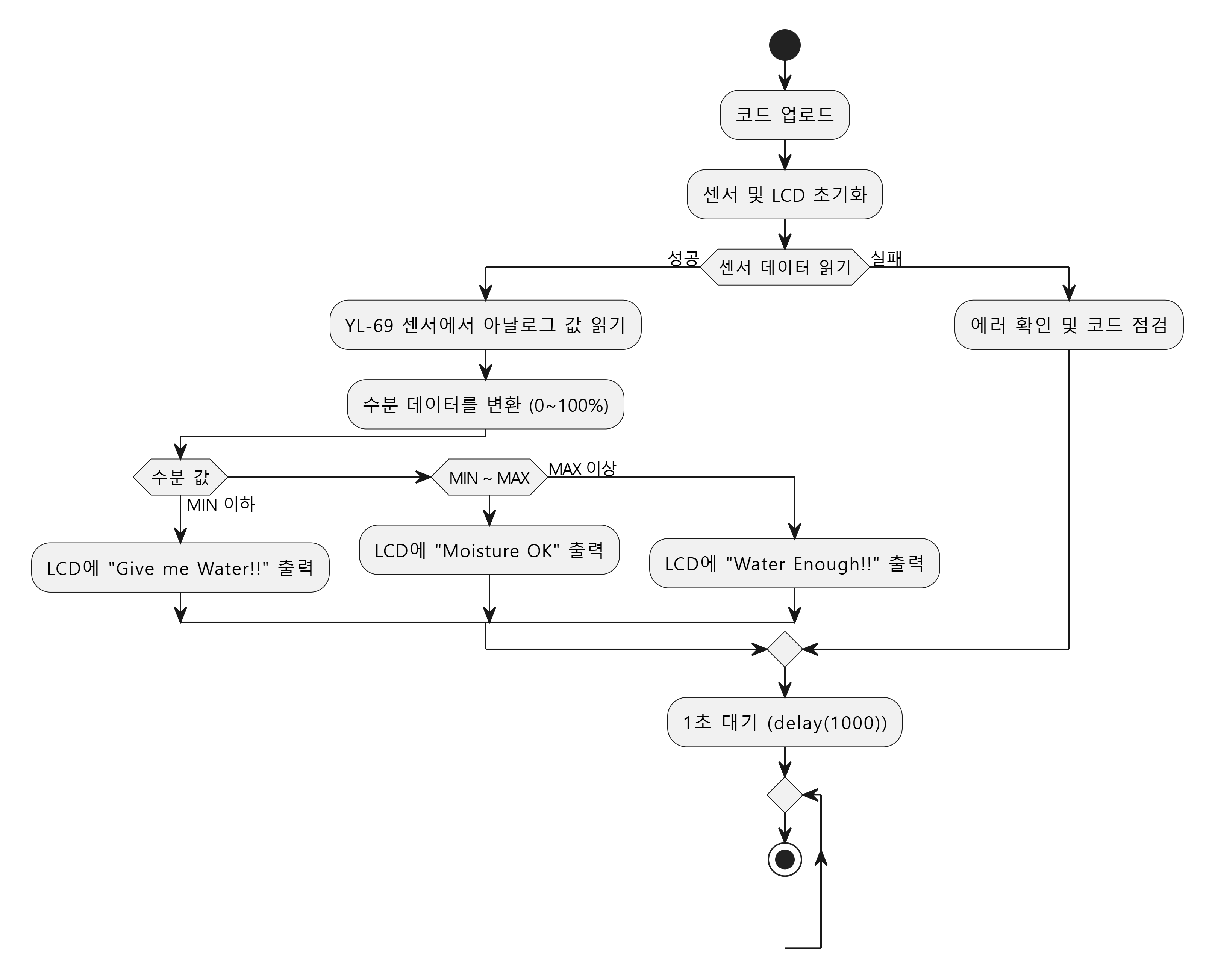 - 측정 단계: YL-69 센서를 통해 토양 수분 값을 읽어옵니다.