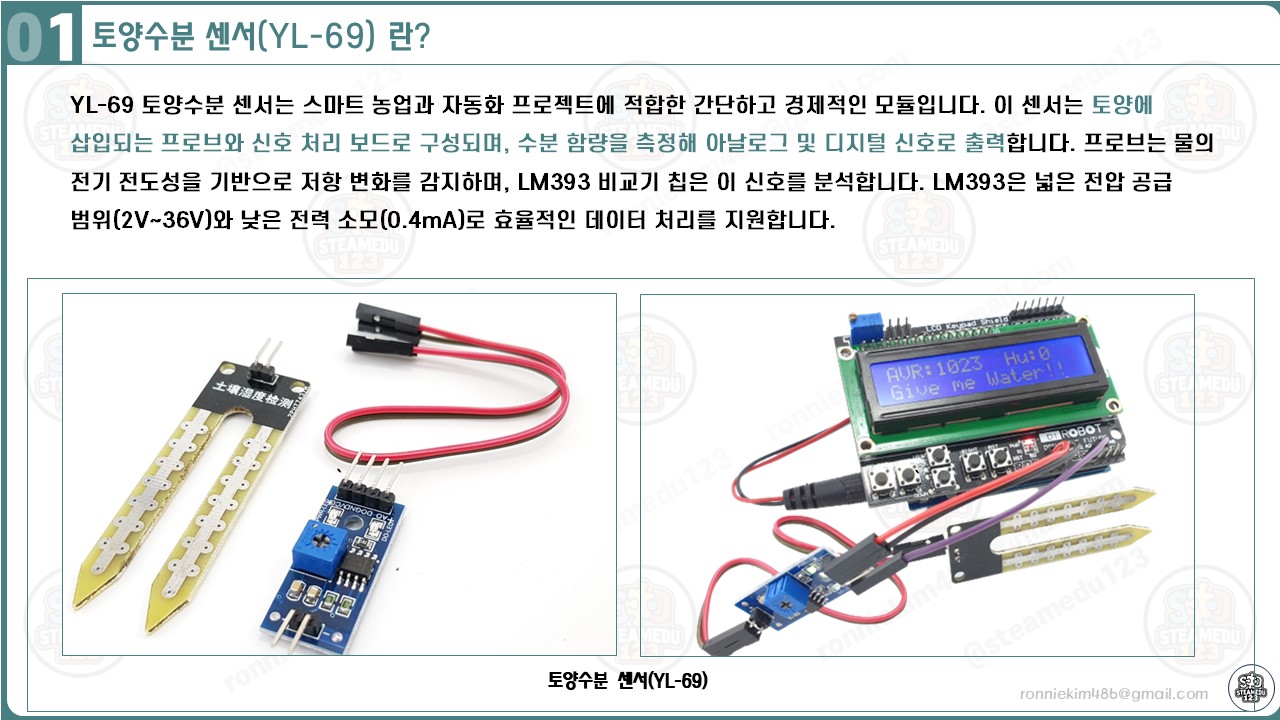 - YL-69 토양수분 센서: 토양의 수분 상태를 측정하여 아날로그 값을 출력.