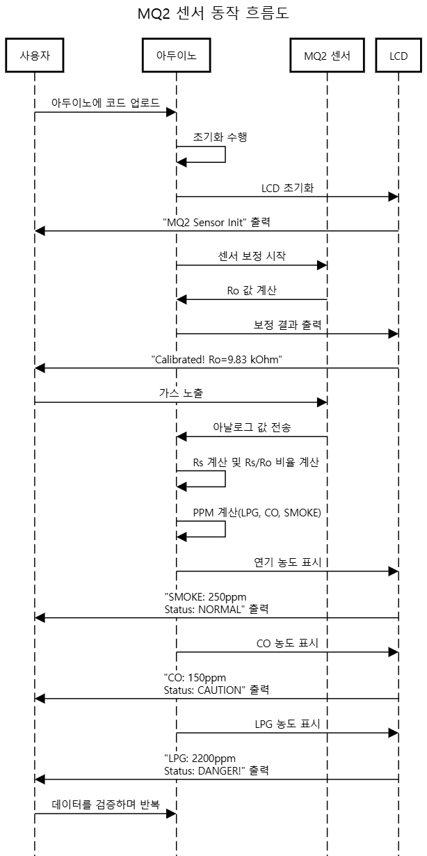 이 동작 순서는 MQ2 센서를 활용하여 실시간으로 환경 내 가스를 모니터링하고 LCD를 통해 사용자에게 정보를 제공하도록 설계되었습니다.