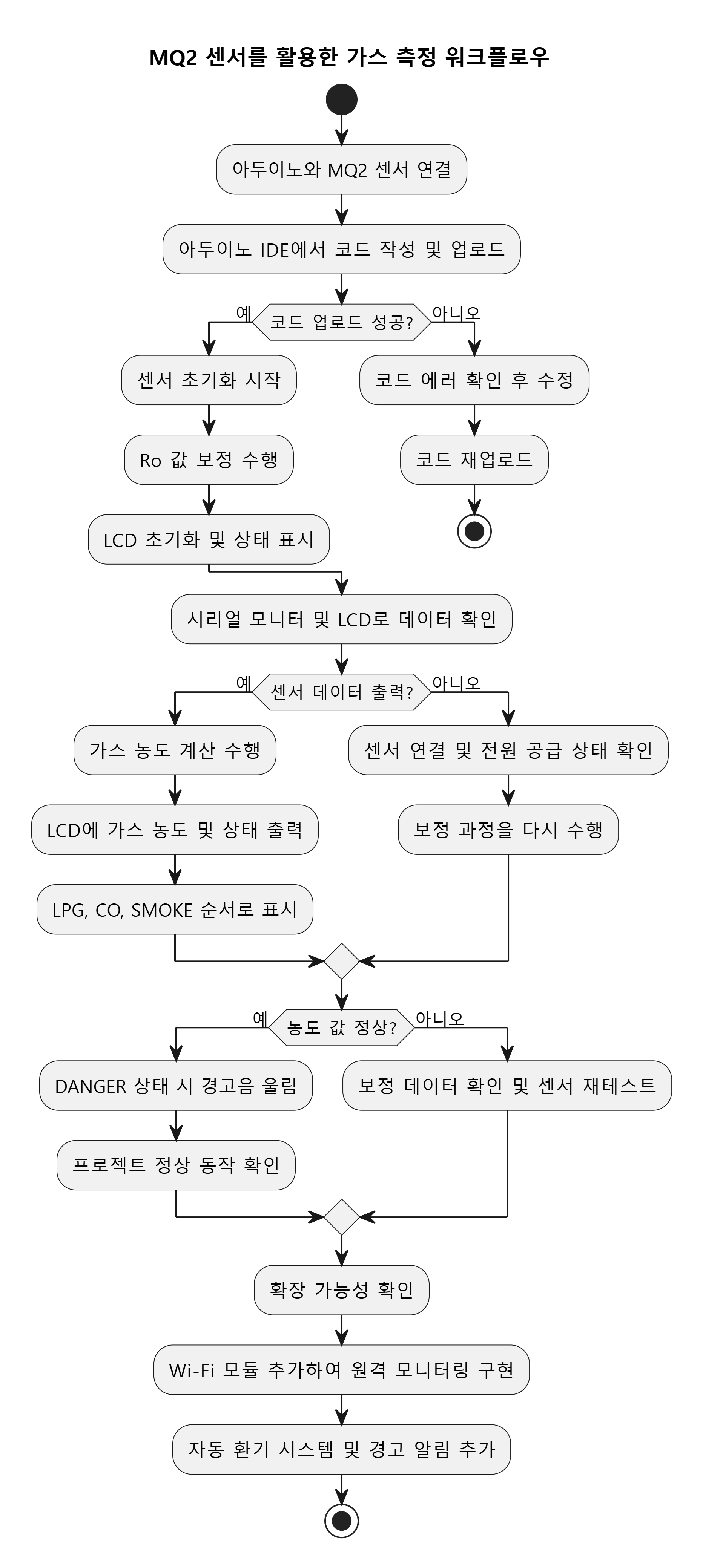 - 시작(Start)에서 아두이노와 MQ2 센서의 연결부터 시작하여 프로젝트를 진행합니다.