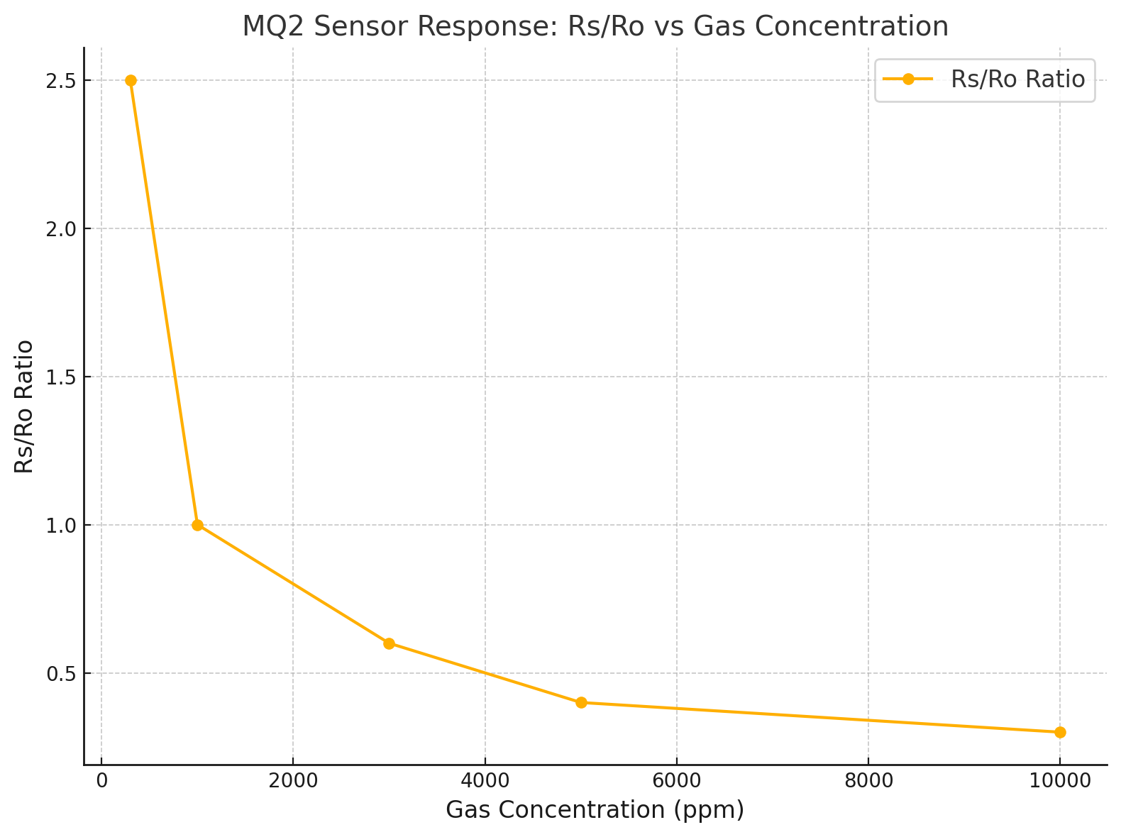 위의 그래프는 Rs/Ro 비율과 가스 농도(ppm) 간의 관계를 보여줍니다. 농도가 증가하면 Rs/Ro 비율은 감소하여, 센서가 가스 농도 변화에 민감하게 반응함을 나타냅니다.