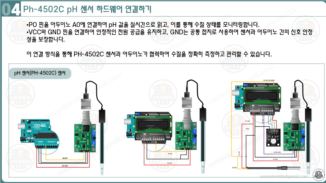 이 연결 방식을 통해 PH-4502C 센서과 아두이노가 협력하여 수질을 정확히 측정하고 관리할 수 있습니다.