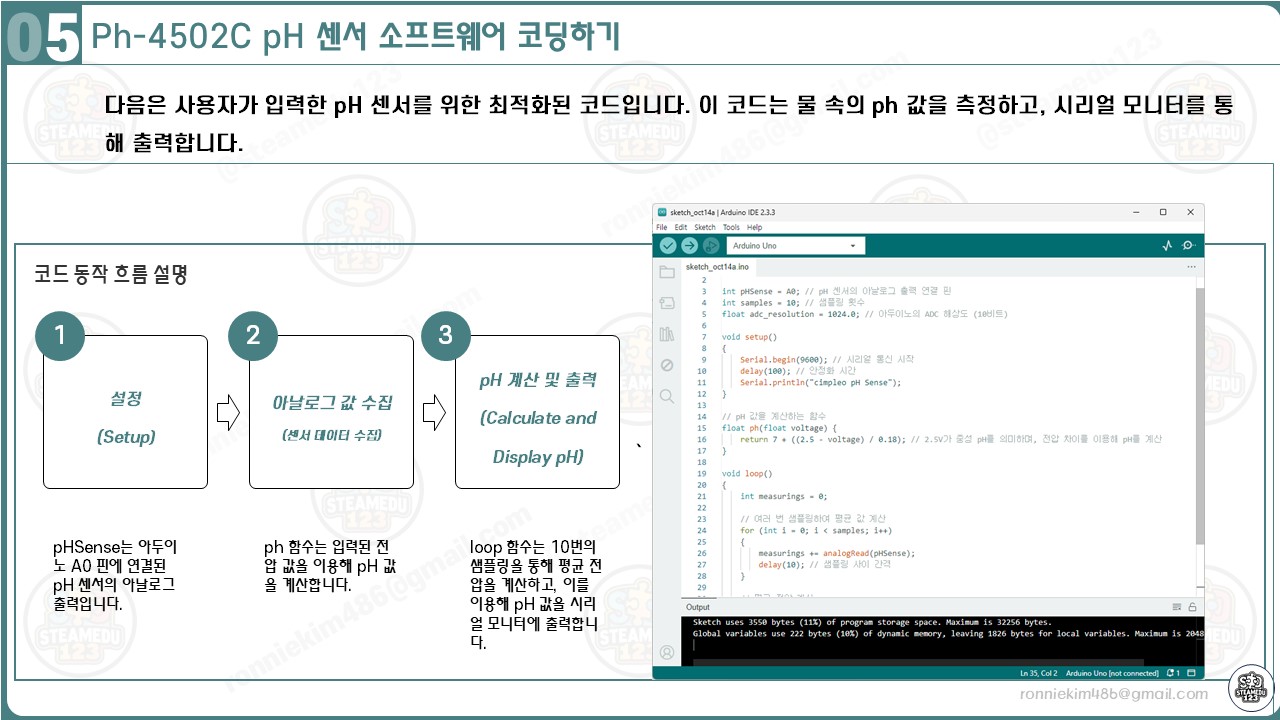 이 세 단계는 pH 센서에서 값을 읽고, 이를 전압으로 변환한 후, 해당 전압을 pH 값으로 변환하여 시리얼 모니터에 표시하는 전체 흐름을 형성합니다.