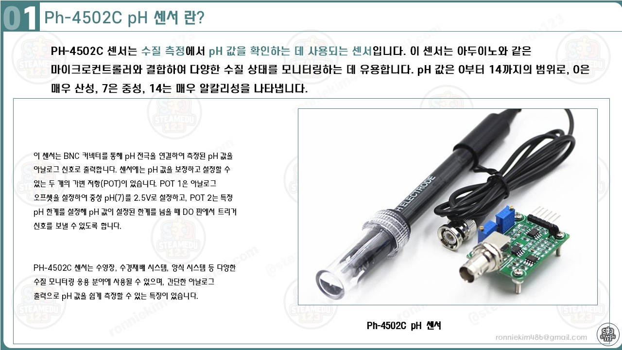 PH-4502C 센서는 수질 측정에서 pH 값을 확인하는 데 사용되는 센서입니다. 이 센서는 아두이노와 같은 마이크로컨트롤러와 결합하여 다양한 수질 상태를 모니터링하는 데 유용합니다. pH 값은 0부터 14까지의 범위로, 0은 매우 산성, 7은 중성, 14는 매우 알칼리성을 나타냅니다.