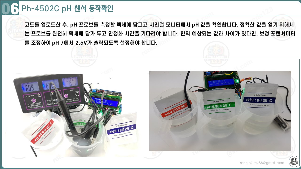 - 만약 예상 값과 차이가 있다면, POT 1을 조정하여 중성 pH 값이 2.5V로 출력되도록 설정해야 합니다. 이렇게 함으로써 정확한 pH 값을 측정할 수 있게 됩니다.