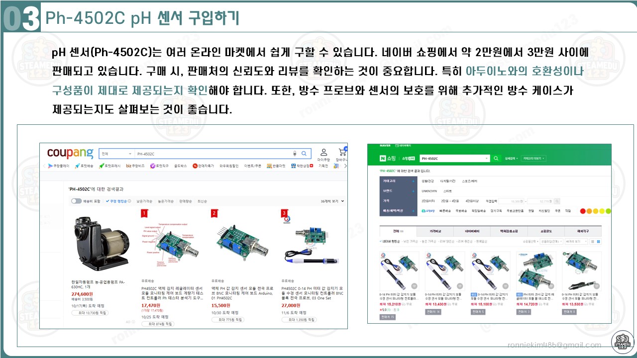 PH-4502C 센서는 다양한 온라인 쇼핑몰에서 구입할 수 있습니다. 네이버 쇼핑에서는 보통 15,000원에서 25,000원 사이의 가격으로 판매되고 있으며, 알리익스프레스에서는 약 $5에서 $10 사이에 구매할 수 있습니다. 구입 시 주의할 점은 판매자의 신뢰도와 리뷰를 확인하는 것이며, 또한 배송비가 포함되어 있는지 확인하는 것이 중요합니다. pH 센서의 정확성은 수질 모니터링에서 매우 중요하므로, 검증된 판매처에서 구매하는 것이 좋습니다.