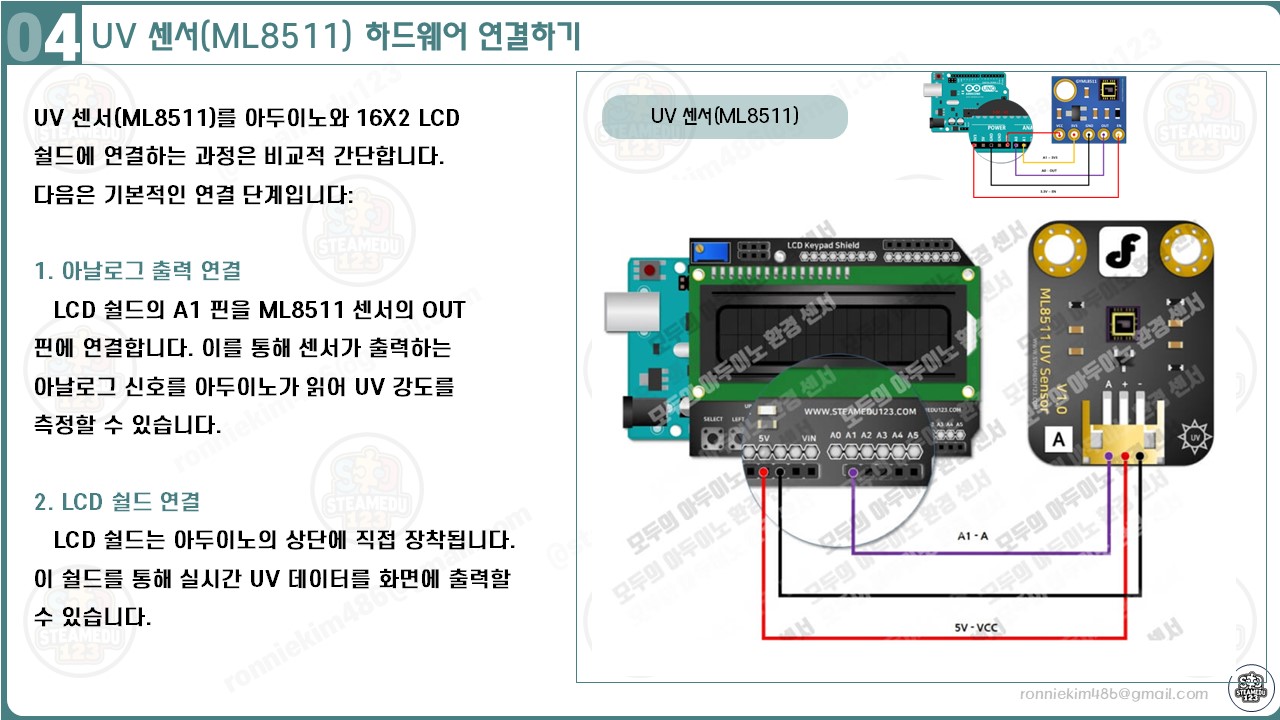 - OUT 핀 연결: ML8511의 출력 핀은 자외선 강도에 비례하는 아날로그 전압을 생성합니다. LCD 쉴드의 A1 핀은 이를 디지털 값으로 변환하기 위한 입력 역할을 합니다.
