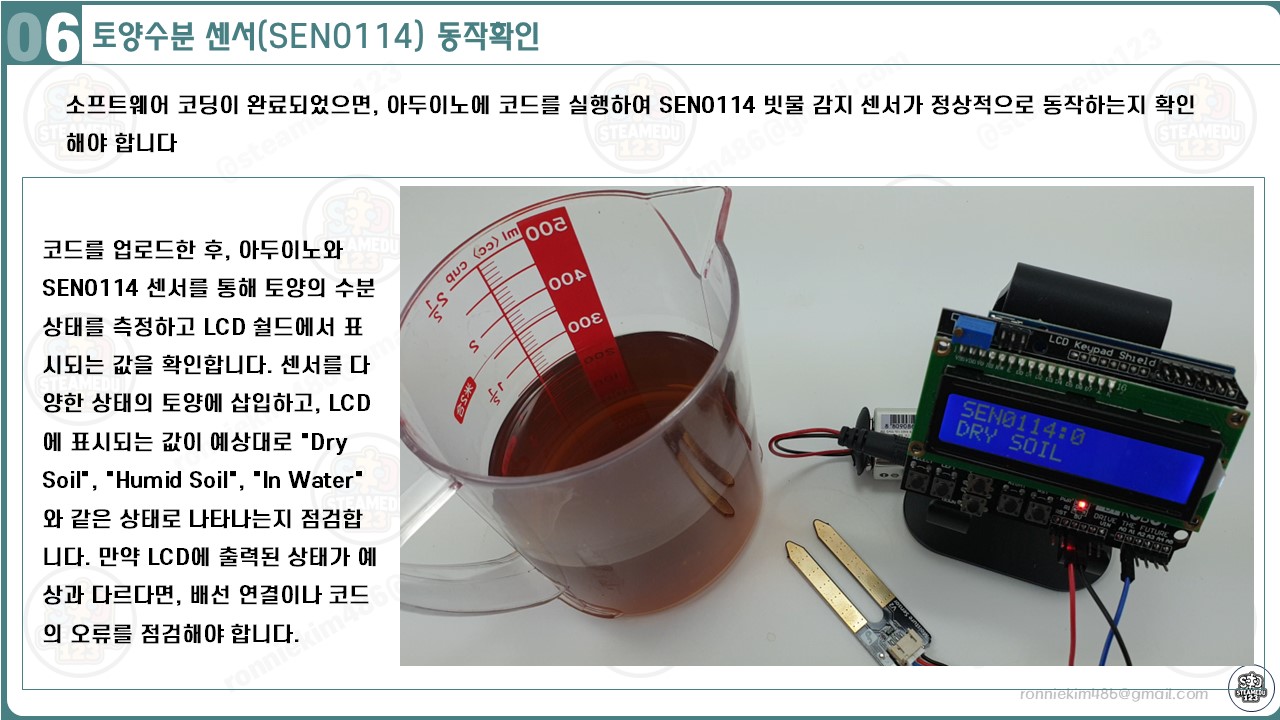 이 프로젝트는 아두이노와 SEN0114 토양수분 센서를 사용하여 토양의 수분 상태를 측정하고 LCD에 표시하는 방법을 단계별로 설명합니다. 초보자도 손쉽게 따라 할 수 있도록 구성된 본 프로젝트는 하드웨어 연결부터 코드 작성, 그리고 출력 확인까지 모든 과정이 포함되어 있습니다. 이제 간단한 토양 관리 프로젝트를 시작해보세요!