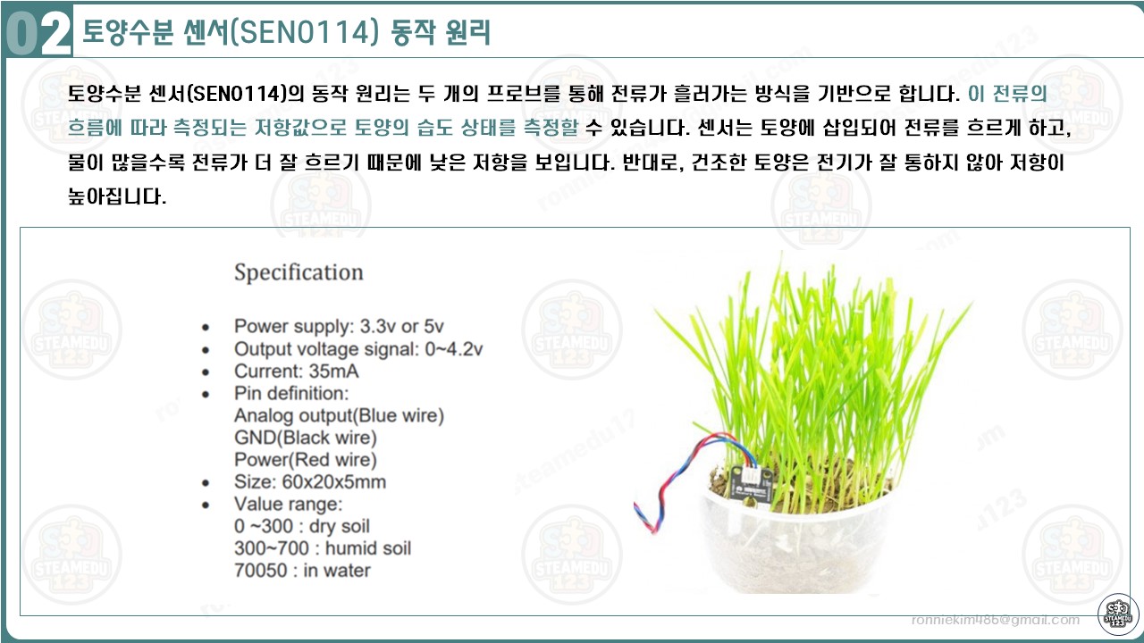 이러한 특성 덕분에 SEN0114는 식물의 상태를 모니터링하고 제어하는 프로젝트에 간편하게 사용할 수 있습니다.