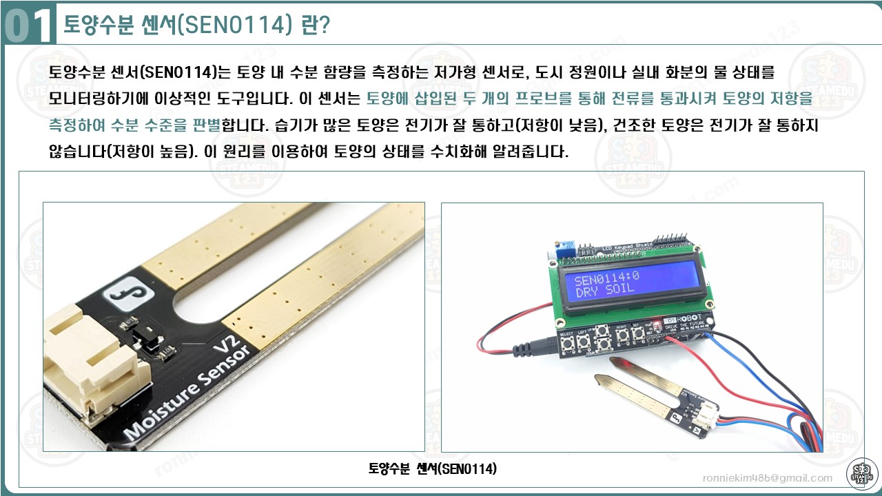 아두이노, 16X2 LCD 쉴드, 그리고 SEN0114 토양수분 센서를 사용하여 토양의 습도 상태를 시각적으로 표시합니다. 하드웨어 연결은 아두이노의 아날로그 핀 A1과 SEN0114 센서의 SIG 핀을 연결하여 아두이노가 센서의 출력을 수신할 수 있도록 합니다.