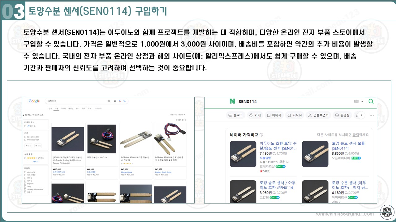 토양수분 센서(SEN0114)는 아두이노와 함께 프로젝트를 개발하는 데 적합하며, 다양한 온라인 전자 부품 스토어에서 구입할 수 있습니다. 가격은 일반적으로 1,000원에서 3,000원 사이이며, 배송비를 포함하면 약간의 추가 비용이 발생할 수 있습니다. 국내의 전자 부품 온라인 상점과 해외 사이트(예: 알리익스프레스)에서도 쉽게 구매할 수 있으며, 배송 기간과 판매자의 신뢰도를 고려하여 선택하는 것이 중요합니다.
