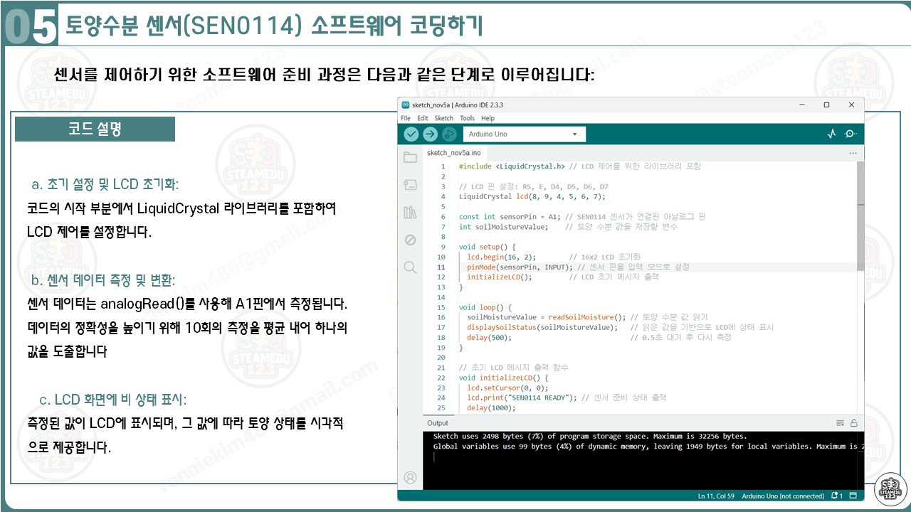 - SEN0114의 아날로그 출력은 센서의 측정된 토양 수분 데이터를 전달하며, 이 신호는 아두이노의 A1 핀을 통해 입력됩니다. 이 설정은 아두이노가 토양의 상태를 아날로그 값으로 인식하고, 이를 코드에서 해석하여 화면에 표시할 수 있도록 합니다.
