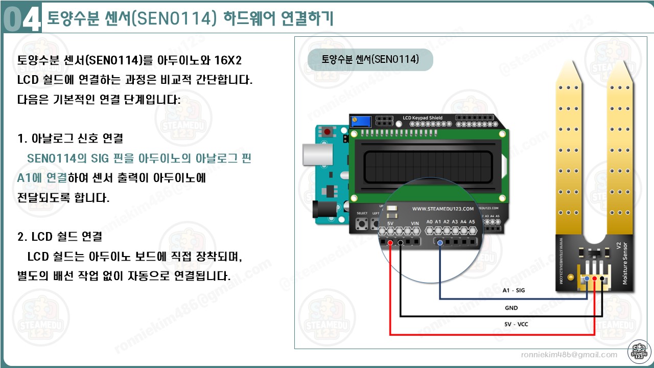 아두이노, 16X2 LCD 쉴드, 그리고 SEN0114 토양수분 센서를 사용하여 토양의 습도 상태를 시각적으로 표시합니다. 하드웨어 연결은 아두이노의 아날로그 핀 A1과 SEN0114 센서의 SIG 핀을 연결하여 아두이노가 센서의 출력을 수신할 수 있도록 합니다.