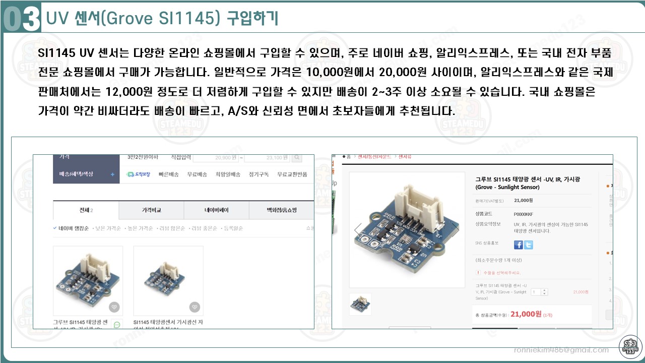 SI1145 UV 센서는 다양한 온라인 쇼핑몰에서 구입할 수 있으며, 주로 네이버 쇼핑, 알리익스프레스, 또는 국내 전자 부품 전문 쇼핑몰에서 구매가 가능합니다. 일반적으로 가격은 10,000원에서 20,000원 사이이며, 알리익스프레스와 같은 국제 판매처에서는 12,000원 정도로 더 저렴하게 구입할 수 있지만 배송이 2~3주 이상 소요될 수 있습니다. 국내 쇼핑몰은 가격이 약간 비싸더라도 배송이 빠르고, A/S와 신뢰성 면에서 초보자들에게 추천됩니다. 구매 시 데이터시트를 제공하거나 인증된 판매처를 선택하는 것이 중요합니다. 센서를 구입할 때는 I2C 프로토콜 지원 여부와 정품 여부를 확인해야 호환성 문제를 방지할 수 있습니다. 또한 프로젝트에 필요한 추가 구성품(LCD 디스플레이, 점퍼 와이어 등)을 함께 구매하면 작업 효율이 높아집니다.