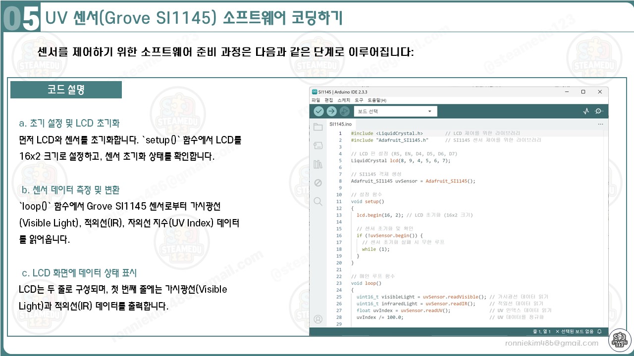 아두이노, LCD 쉴드(16x2), Grove SI1145 센서를 활용한 코드는 다음과 같은 동작 순서를 따릅니다. 이 코드는 센서 데이터를 읽고 이를 LCD에 출력하는 과정을 체계적으로 구성합니다. 각 단계는 기능적으로 분리되어 있으며, 초보자도 이해할 수 있도록 구체적으로 설명하겠습니다