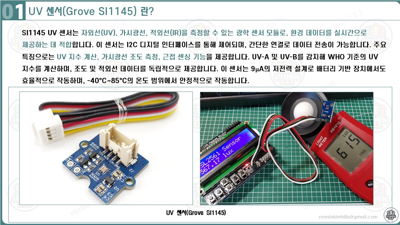 SI1145 UV 센서 프로젝트를 통해 사용자는 빛(가시광선, 적외선)과 자외선 데이터를 효과적으로 측정하고 분석하는 방법을 배울 수 있습니다. 이 프로젝트는 초보자가 아두이노와 센서 간의 상호작용을 이해하고, 데이터를 실시간으로 LCD에 출력하는 경험을 제공합니다.