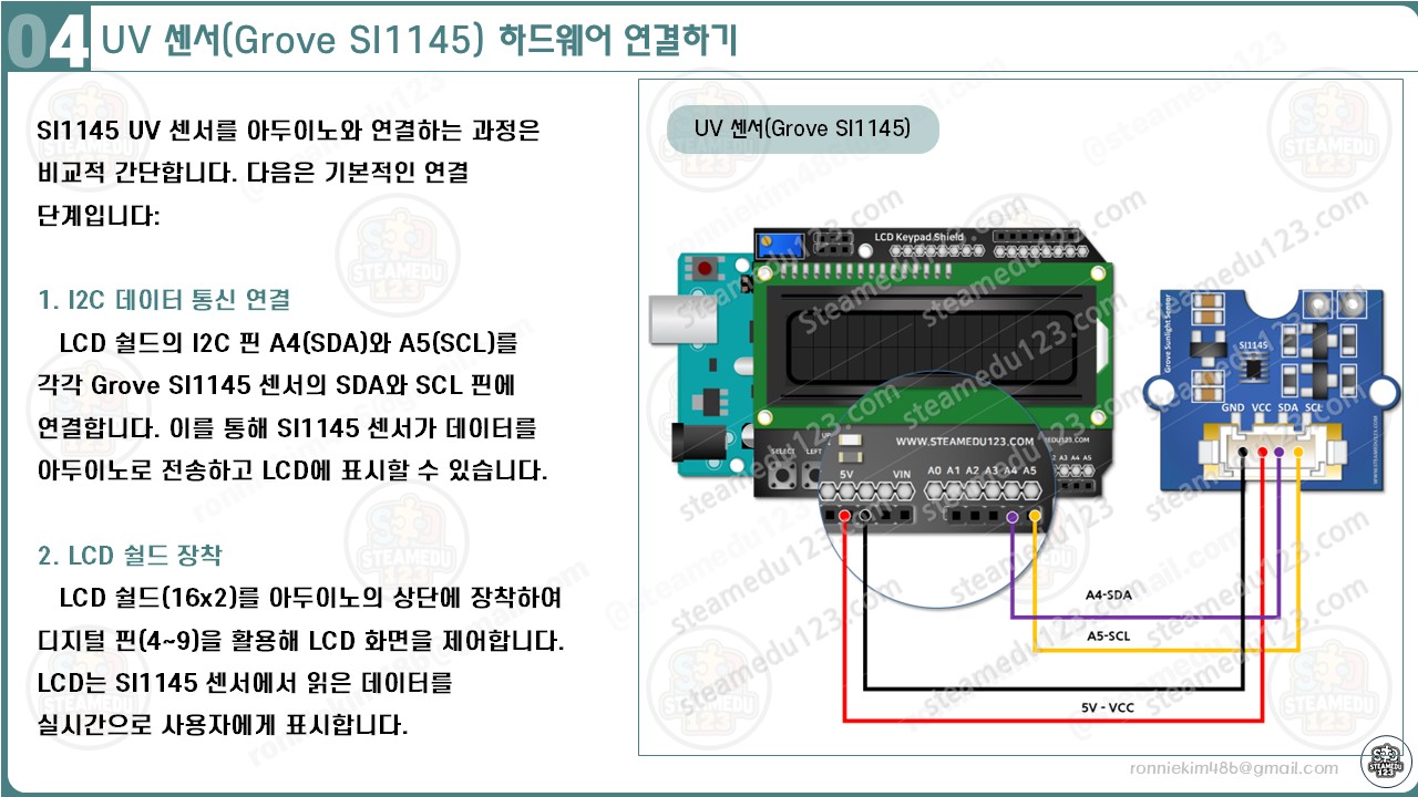 아두이노와 LCD 쉴드(16x2), Grove SI1145 UV 센서를 연결하여 자외선(UV) 및 가시광선 데이터를 실시간으로 출력할 수 있습니다. 이 구성에서는 LCD 쉴드를 아두이노에 장착한 뒤, LCD 쉴드의 A4(SDA)와 A5(SCL) 핀을 Grove SI1145 센서의 SDA 및 SCL 핀에 연결합니다. 아래는 구체적인 연결 방법과 이유를 설명합니다.
