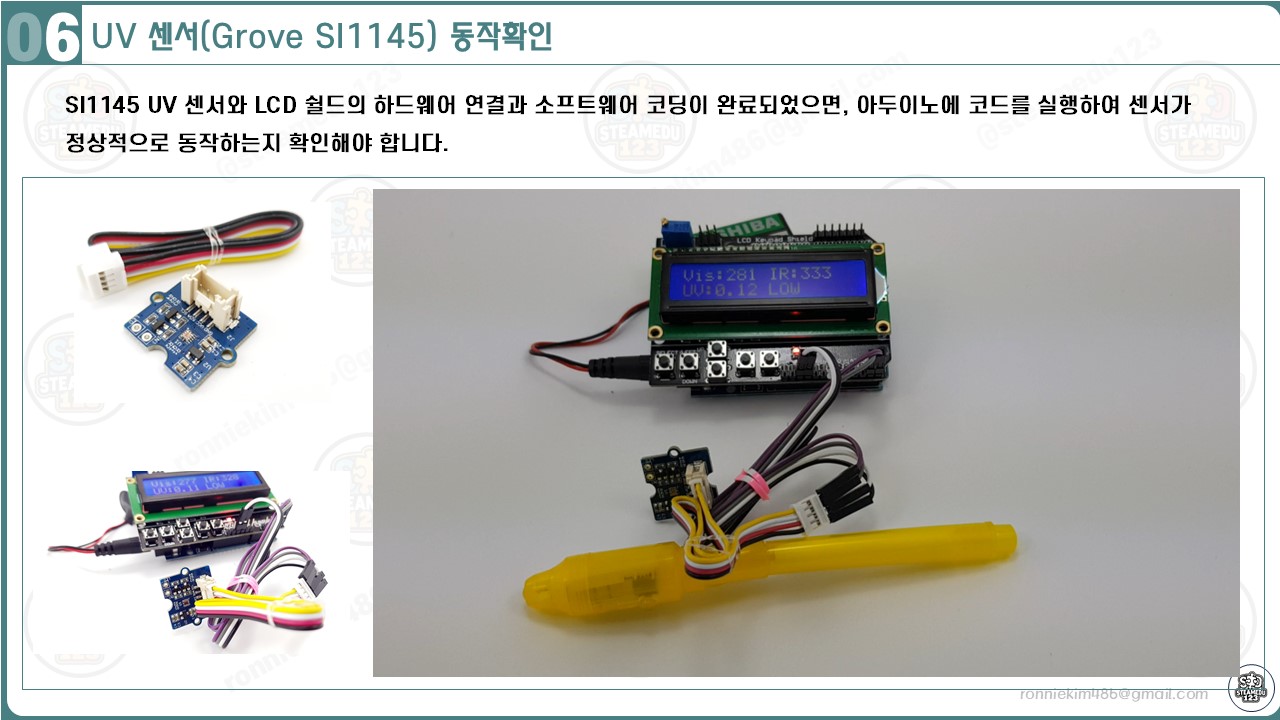 - LCD 쉴드와 Grove SI1145 센서가 아두이노 보드와 정확히 연결되었는지 확인합니다.